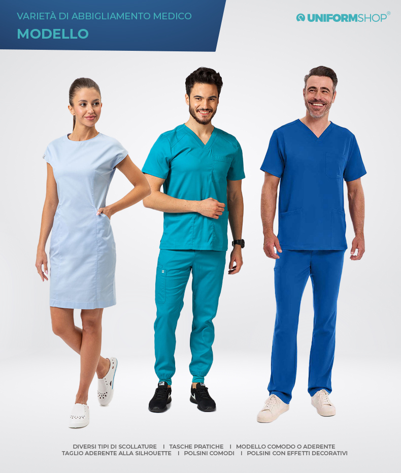 Negli ultimi anni, il mercato dell’abbigliamento medico ha subito cambiamenti sostanziali. Oggigiorno, gli stilisti competono tra loro presentando ai rappresentanti del settore sanitario nuove idee per modelli e colori alla moda e unici. Esistono modelli di abbigliamento medico personalizzato per ogni tipo di persona, che soddisfano le preferenze e le esigenze di tutti gli operatori sanitari. Il mercato offre numerosi tipi di capi di abbigliamento per soddisfare le esigenze personali dei propri utenti: